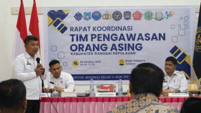 SALAKAN, RADAR SULAWESI – Dalam upaya memperkuat sinergi lintas instansi dalam pencegahan Tindak Pidana Perdagangan Orang (TPPO) dan pemberangkatan Pekerja Migran Indonesia Nonprosedural (PMI-NP), Kantor Imigrasi Kelas II Non TPI Banggai menggelar pengukuhan Desa Luk Panenteng, Kecamatan Bulagi Utara, sebagai Desa Binaan Imigrasi, yang kemudian dilanjutkan dengan rapat koordinasi Tim Pengawasan Orang Asing (TIMPORA) di Penginapan Bharata, Baka, Kabupaten Banggai Kepulauan, Kamis 9 Oktober 2025.